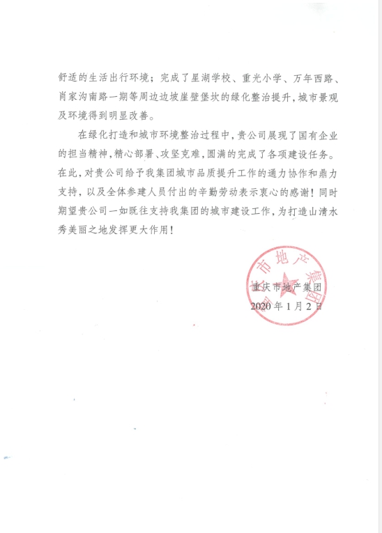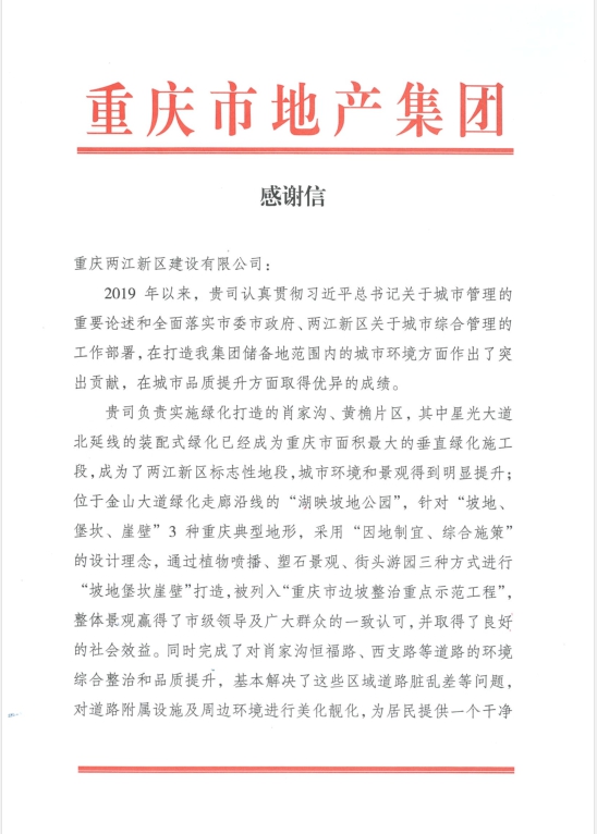谢谢信中指出,,,,,,,在项目治理团队的配合起劲下,,,,,,,地产集团照母山片区绿化品质提升工程(一期)项目为都会情形方面做出了突出孝顺,,,,,,,在都会品质提升方面取得了优异效果。。。。。。。。