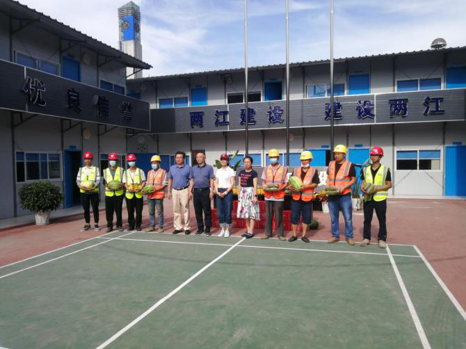 李宁董事长将解暑慰问品亲自送到项目部员工及一线工人代表手上,,,,,,并嘱咐项目治理职员要严酷执行高温室外作业错时施工的相关划定,,,,,,要“以人为本”落实高温天气作业清静提防步伐,,,,,,切实做好目今防暑降温事情,,,,,,避免工人中暑,,,,,,确保清静。。。。。在欢声笑语中,,,,,,工人们接过慰问品,,,,,,谢谢之情溢于言表,,,,,,丝丝清凉暖人心。。。。。