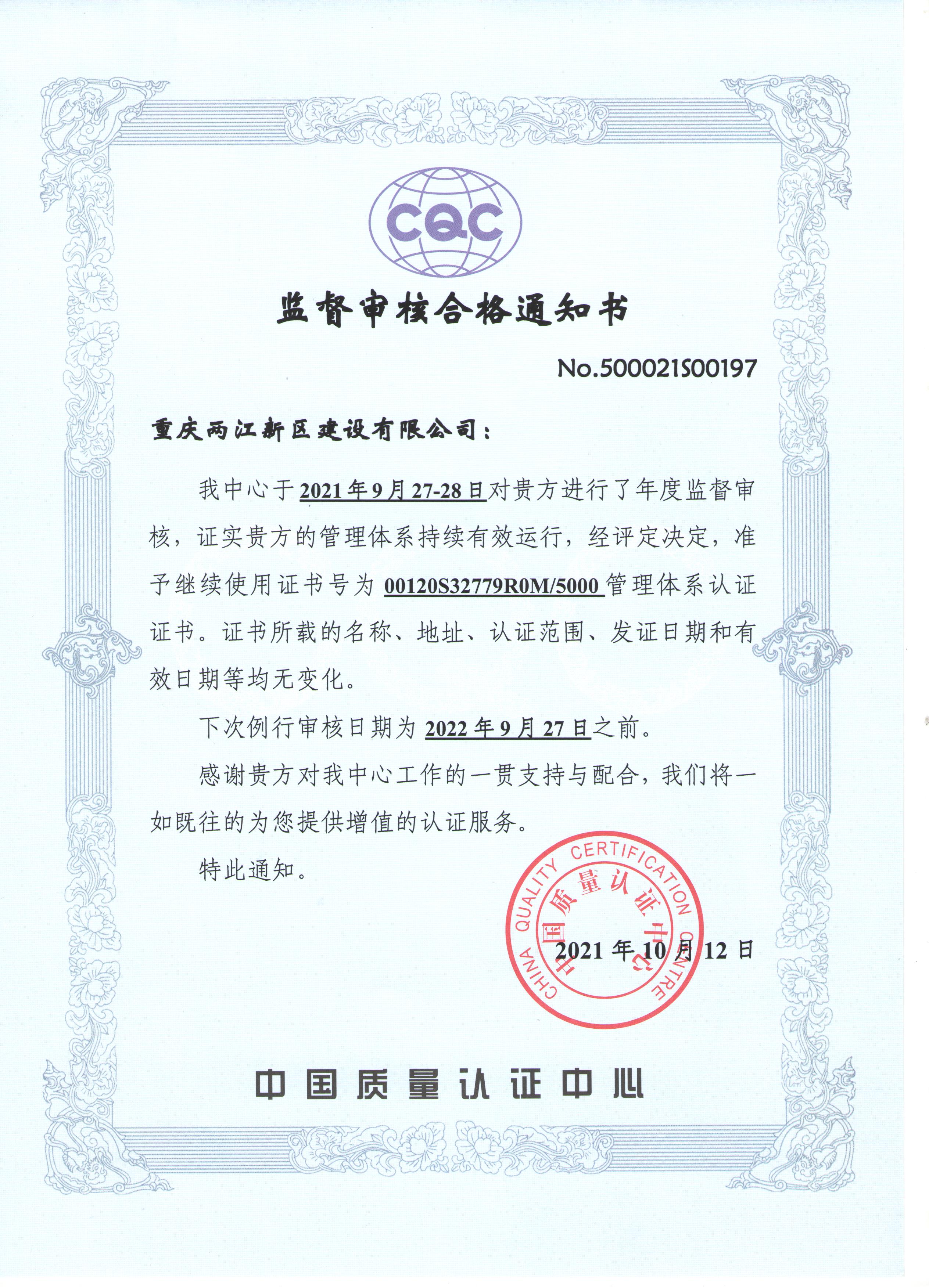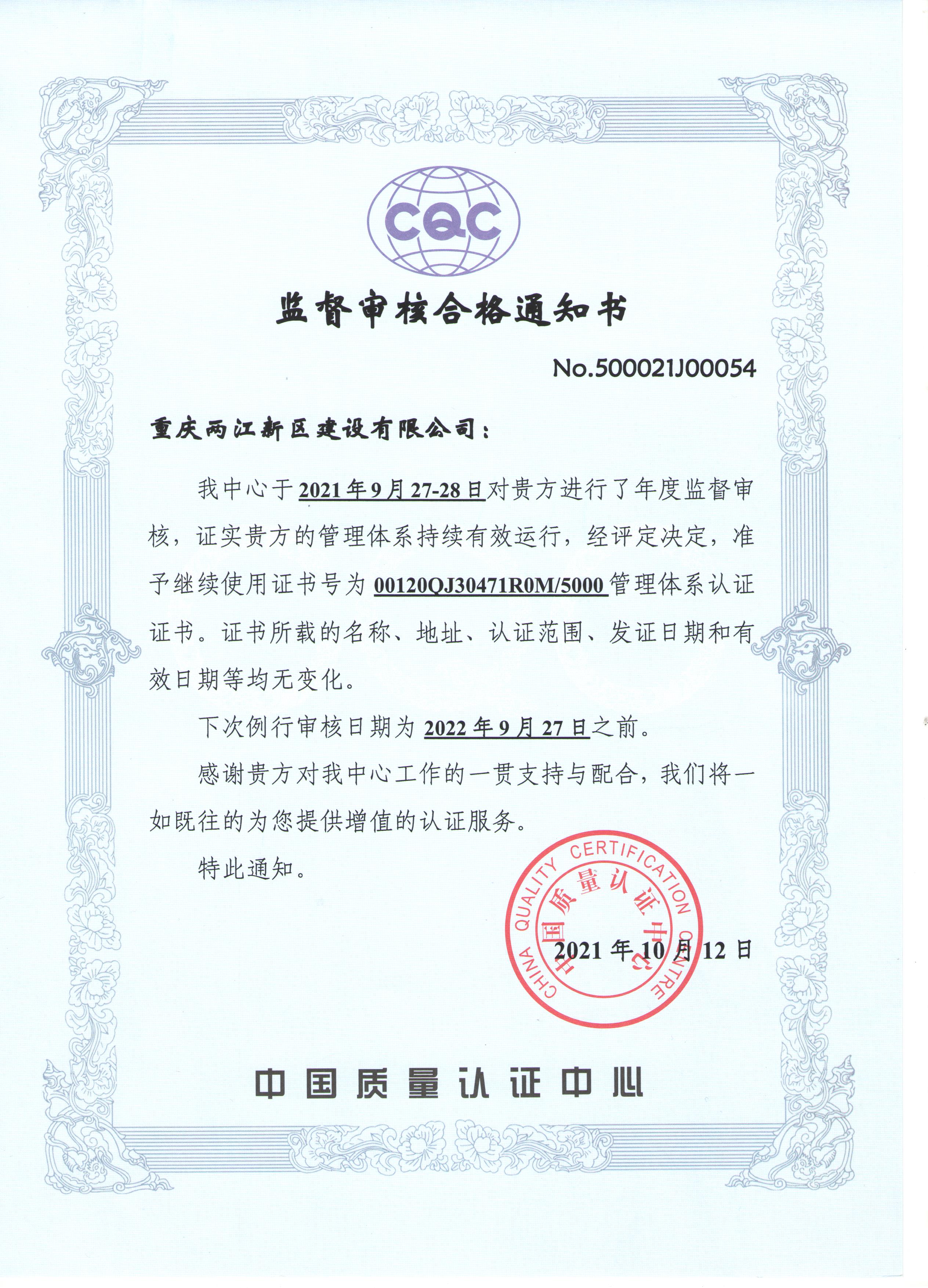 本次监视审核接纳现场视察、查阅文件纪录、面谈交流等审核证据的要领对公司谋划历程、施工总承包现场施工历程、质量治理、物资采购、情形及职业康健清静、人力资源等危害,,,,,以及合规义务、危险源与情形因素辨识、疫情时代防控步伐等方面临公司治理切合性及有用性举行了审核评价。。。。。。最后经专家们审核评定公司CQC治理系统一连有用运行,,,,,揭晓了CQC监视审核及格通知书。。。。。。