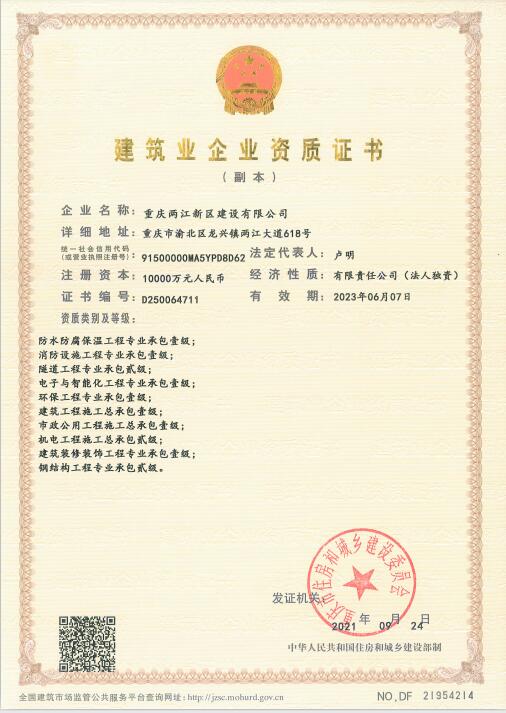泉源:总工办 林彬 宣布日期:2021/11/26 【打印此文】凭证《重庆市人民政府办公厅关于印发重庆市推学习建工业现代化促学习建业高质量生长若干政策步伐的通知》(渝府办发〔2020〕107号)、重庆市住房和城乡建设委员会《关于推学习建业企业资质治理“放管服”刷新试点事情的通知》(渝建管〔2021〕96号)文件内容要求,,,,,,团结九游国际建设公司现有工程手艺职员数目、专业特点,,,,,,战略生长目的,,,,,,在公司原有施工总承包和专业承包资质的基础上,,,,,,通过公司全体干部职工的配合起劲,,,,,,克日,,,,,,公司新增修建工程电子与智能化工程、消防设施工程、防水防腐保温工程、环保工程4个专业承包壹级资质,,,,,,1个隧道工程专业承包贰级资质。。。。。。