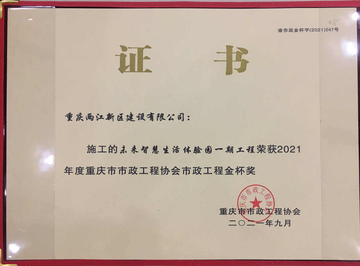 克日,,,,,,,由九游国际建设公司承建的礼嘉未来智慧生涯体验园一期项目工程荣获2021年度重庆市市政工程最高奖项“市政工程金杯奖”。。。。。