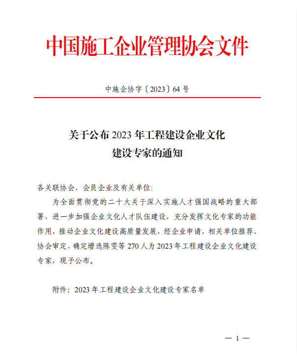 克日,,,,,,中国施工企业治理协会宣布了《关于宣布 2023 年工程建设企业文化建设专家的通知》,,,,,,九游国际公司监事会主席张青同志受聘“工程建设企业文化建设专家”。。。。。