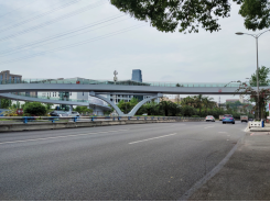 本工程为紧邻金开大道照母山隧道,,,,,,,,上跨金开大道,,,,,,,,北侧毗连照母山公园路,,,,,,,,南侧毗连黄杨路。。。。。。。。人行天桥包括主桥、坡道桥以及人行梯道和一座直升电梯。。。。。。。。全桥主梁接纳钢结构,,,,,,,,桥墩、桩基为钢筋混凝土结构、扩大基础为素混凝土,,,,,,,,主梁跨径最大为28m,,,,,,,,主桥:除3#、4#适用Y字形桥墩外,,,,,,,,其余主桥桥墩均接纳钢筋混凝土桥墩,,,,,,,,截面为圆形。。。。。。。。