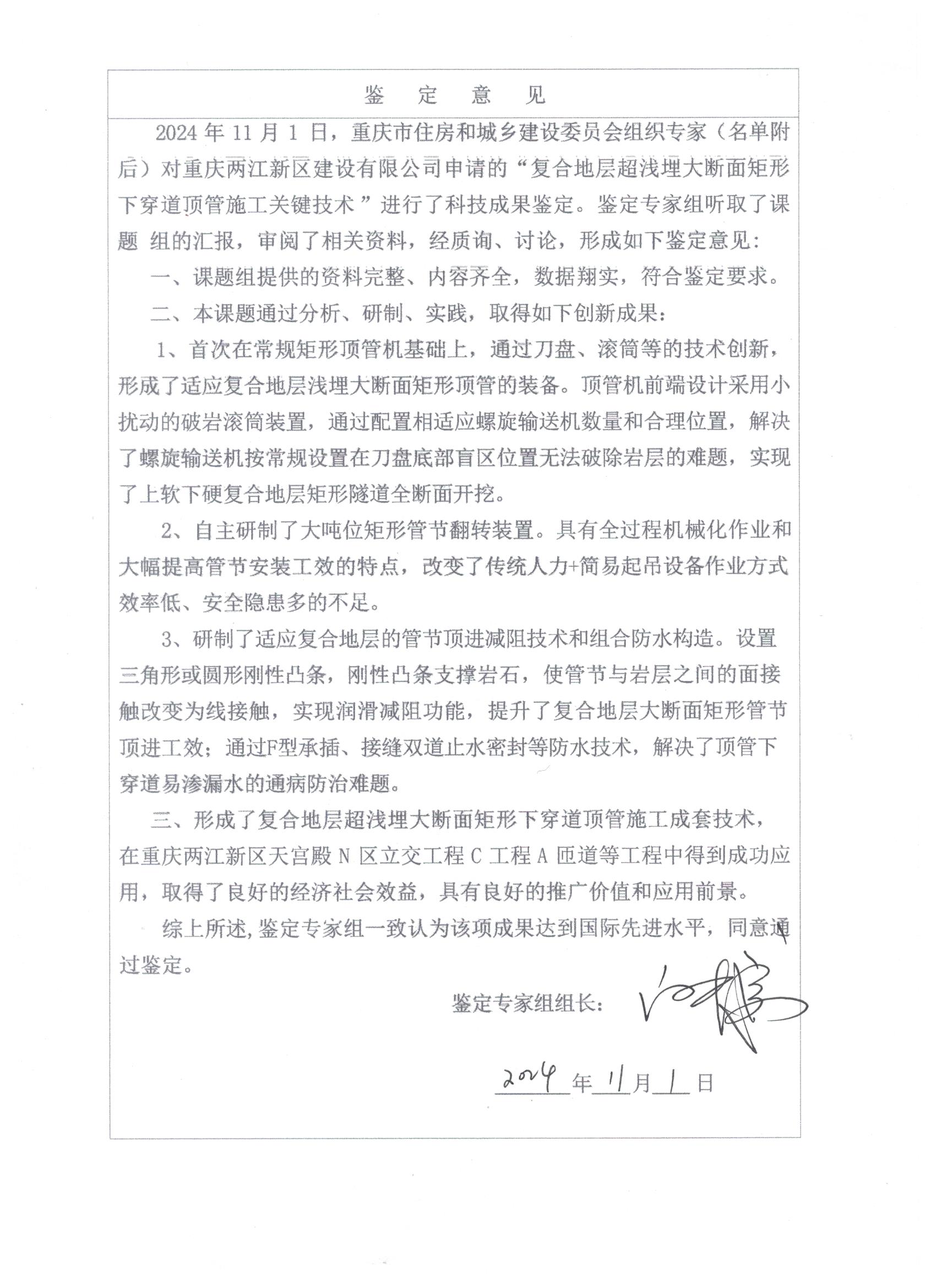 判断效果批注,,,,,,公司自主研发的“复合地层超浅埋大断面矩形下穿道顶管施工”重庆市工程建设要害手艺效果抵达了国际先进水平,,,,,,为公司探索“科技兴企,,,,,,转型生长”破解修建行业生长难题指明又一个新的思绪和偏向,,,,,,其作用和意义重大且深远——公司在地下工程建设领域的科技立异和手艺攻关取得重大突破的同时,,,,,,不但提升了公司在行业内的竞争力和影响力,,,,,,尚有助于推动本市修建行业的手艺前进,,,,,,为行业内的其他企业提供可借鉴的先进履历和手艺支持。。。。。。