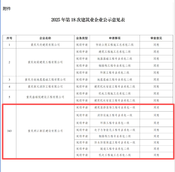 克日,,,,,重庆市住房和城乡建设委员会正式宣布《2025年第18批次修建业企业资质审查意见公示》,,,,,九游国际申报的修建业企业资质已通过市级主管部分的严酷审查,,,,,进入公示阶段。。。。。